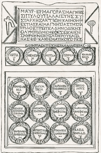 M(arcus) Aur(elius) Hermagoras aus Magnesia am Sipylos, Ringer, Präsident der Athleten bei den Aktia, in Mompsuestia (Kilikien) und in seiner Heimat Magnesia, Vorsitzender der Hellanodiken ( Kampfrichter) bei den Olympia in Ephesos und in Smyrna, Sieger in 29 heiligen Agonen und in 127 Prämien - Agonen. Ein 'heiliger (Sieg)' bei den Olympia in Pisa, weitere 'heilige':19.