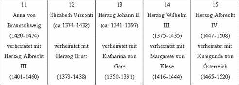Somit zeigte der Erker ursprünglich eine Ahnenreihe von Otto von Wittelsbach bis zur Generation seines Erbauers Sigismund, wobei den beiden bedeutendsten Mitgliedern des Hauses, dem ersten Herzog wie dem ersten Kaiser, die vornehmsten Plätze eingeräumt wurden. Mit Feld 15, das erst nach der Heirat Albrecht IV. mit Kunigunde von Österreich 1487 möglich ist, ist überdies ein Terminus ante quem non für die Entstehung des Zyklus' gegeben.