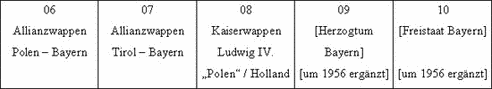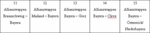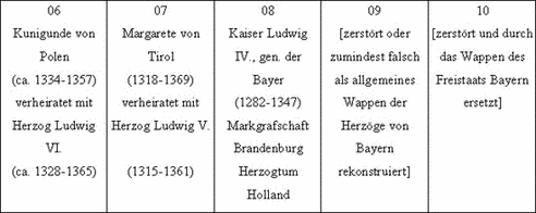 Bei Burmeister (1999), S. 48, Fußnote 93. die dortige Identifikation, obere Reihe: “Pfalz-Bayern, Herzogtum Cleve / Visconti von Mailand, Pfalz-Bayern / Ludwig d. Bayer, Tirol (Farben vertauscht), Habsburg / Herzogtum Braunschweig, Pfalz-Bayern / Markgrafschaft Brandenburg, Pfalz-Bayern” Untere Reihe: “Pfalz-Bayern, Grafen von Görz / Tirol (Farben vertauscht), Pfalz-Bayern / Pfalz-Bayern, Österreich – Steiermark / Herzoglich bayerisches Wappen / Bayerisches Staatswappen (seit 1950)” Der Vergleich mit der hier vorgelegten Deutung sei jedem Leser für sich überlassen.