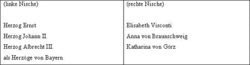 Die rechte Nische zeigt dagegen, wie an einen überstilisierten Stammbaum angehängt, drei Wappen in der Verteilung 1:2. Sie stehen für Mailand, [39] Braunschweig [40] und Görz [41]. Während das linke, bayerische Wappen für sich keinem Herrscher zugeteilt werden kann, kann die Identifikation der Personen, auf die sie sich beziehen soll nur über die drei Wappen rechts erfolgen, bei denen es sich zwangsläufig um Wappen von Ehefrauen Wittelsbacher Herrscher handeln muß. Geht man hier analog zur Erkerbemalung vor, von der die Wappen der rechten Nische bis hin zu den Fehlern im Görzer Wappen offenbar abgemalt worden sind, so handelt es sich bei den dargestellten Personen um