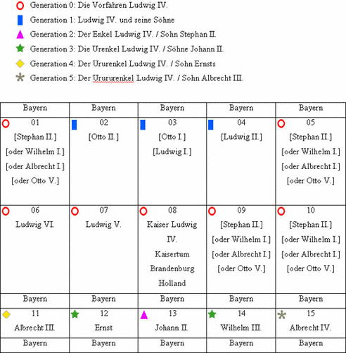 Geht man vom Mittelpunkt der ehemals 15 Wappen, dem Kaiserwappen Ludwig IV. aus, so lässt sich der Wappenzyklus als eine Darstellung von ihm und seinen Kindern und Nachfahren (nebst zugeheirateten Partnern und damit Ansprüchen) deuten. Die durch die Wappen dargestellten Personen wären demnach: [22]